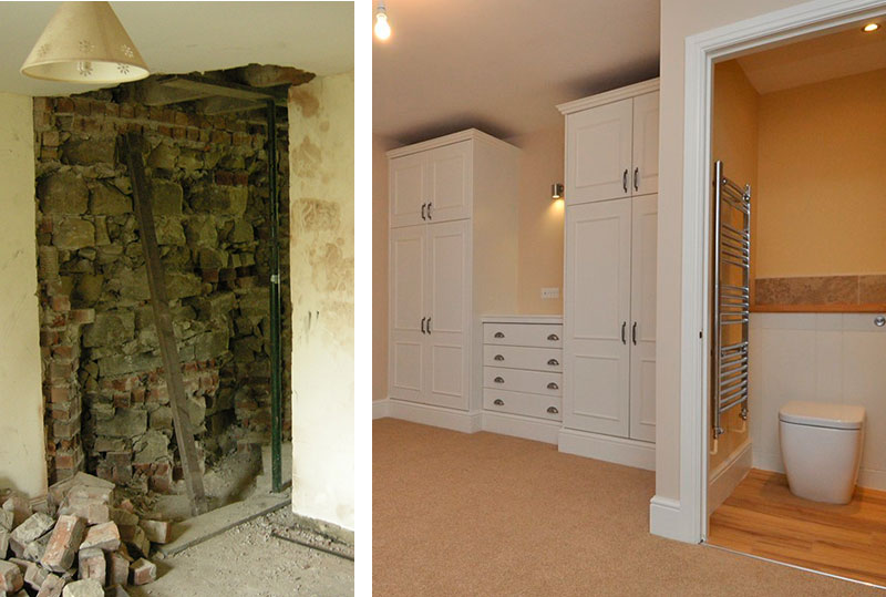 The chimneys were also removed in the second bedroom, to create wardrobe space, and in the master bedroom where an enormous corner flue was hacked out to create an en-suit bathroom. This proved to be quite a task. It took several days to remove tons of stone and brick and leave the chimney stack above supported by two giant structural lintels. But by taking out the corner flue and occupying a slice off the neighbouring bedroom a decent sized En-suit was created with a full sized bath. The room was finished with stone travertine and solid beach tops.